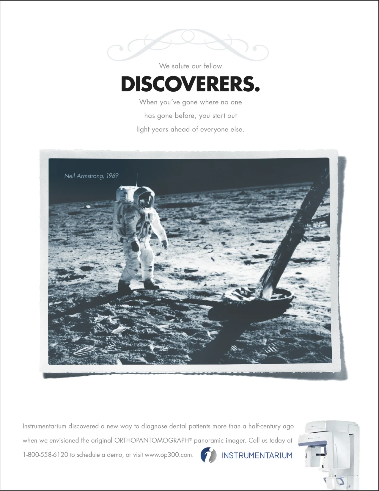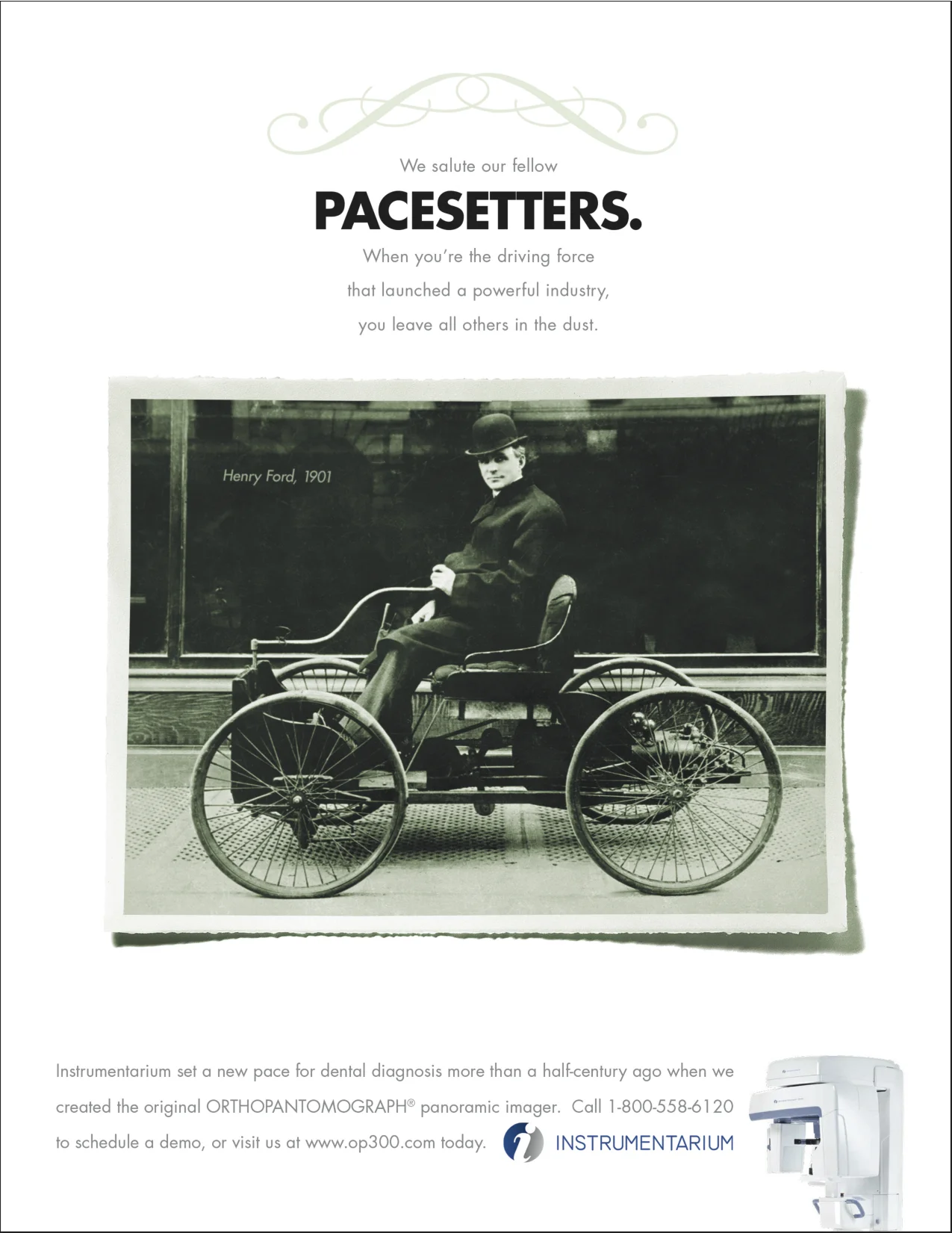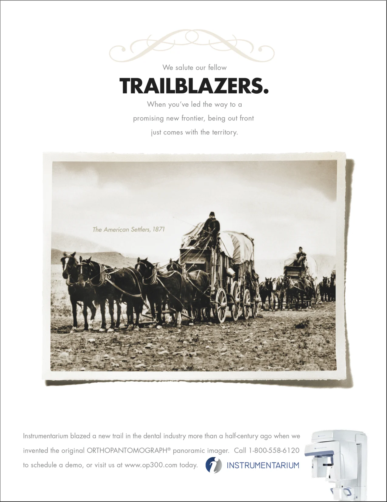 Hence, Dave Redemann concepted and wrote the outstanding “Salute to Pioneers” campaign, which placed Instrumentarium in some very legendary company. It included the three print ads pictured here, as well as three postcards, all targeted at dentists and dental clinics throughout the United States.