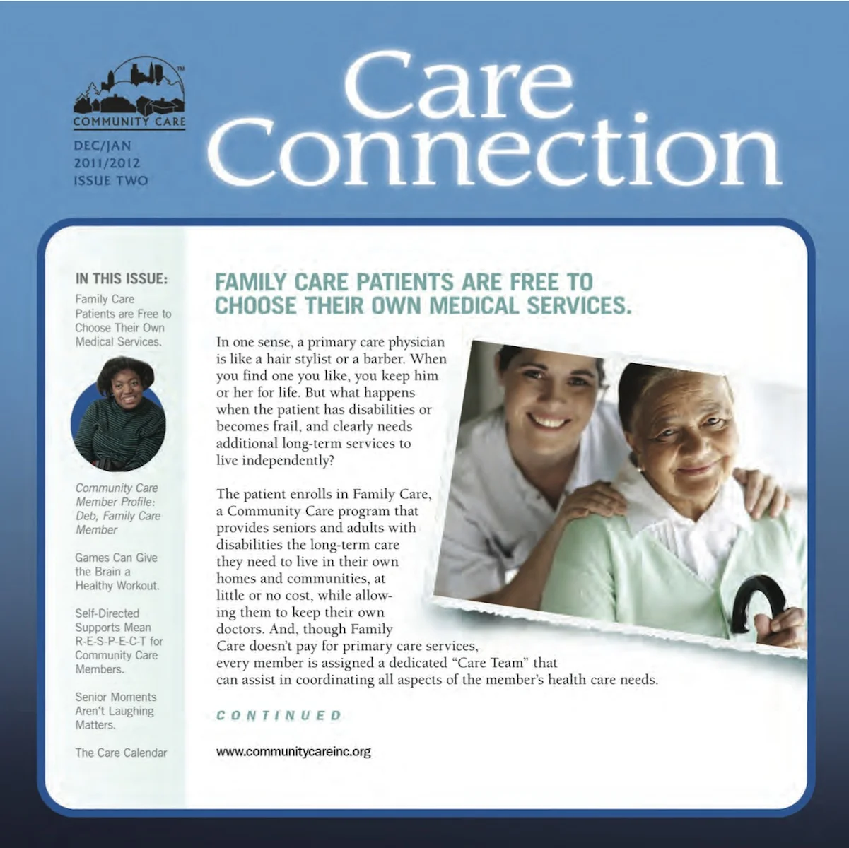 Community Care is a private, non-profit managed care organization dedicated to serving seniors and adults with disabilities. Dave Redemann has had a long-term longform relationship with Community Care. Over the years, he developed a friendly, compassionate marketing voice for the organization in its printed collateral materials, its annual reports and a multifaceted web site.